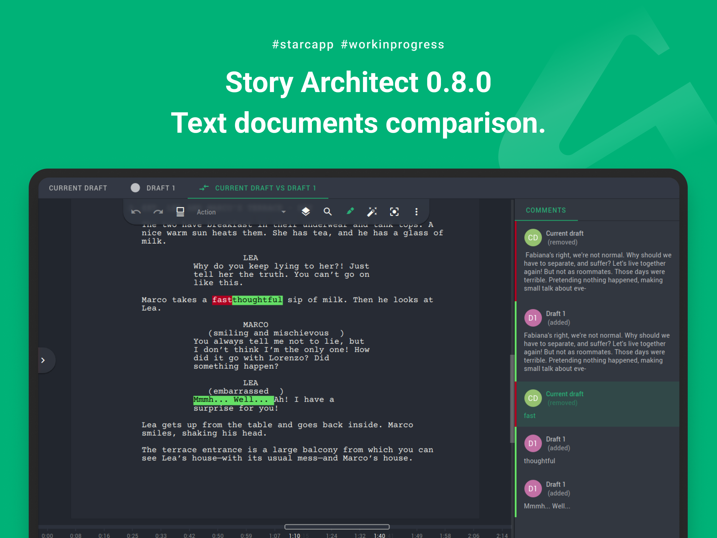 Another addition in version 0.8.0 is the ability to compare text documents. Comparison is available both between different documents (select two scripts or text documents and choose “Compare documents”) and between drafts within the same document (right-click the draft list panel and choose “Compare drafts”).