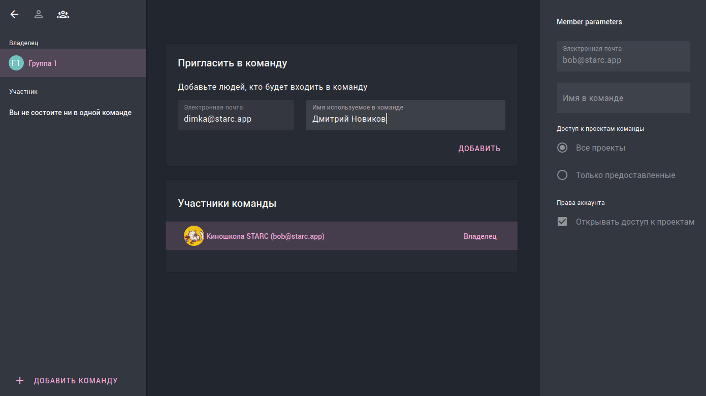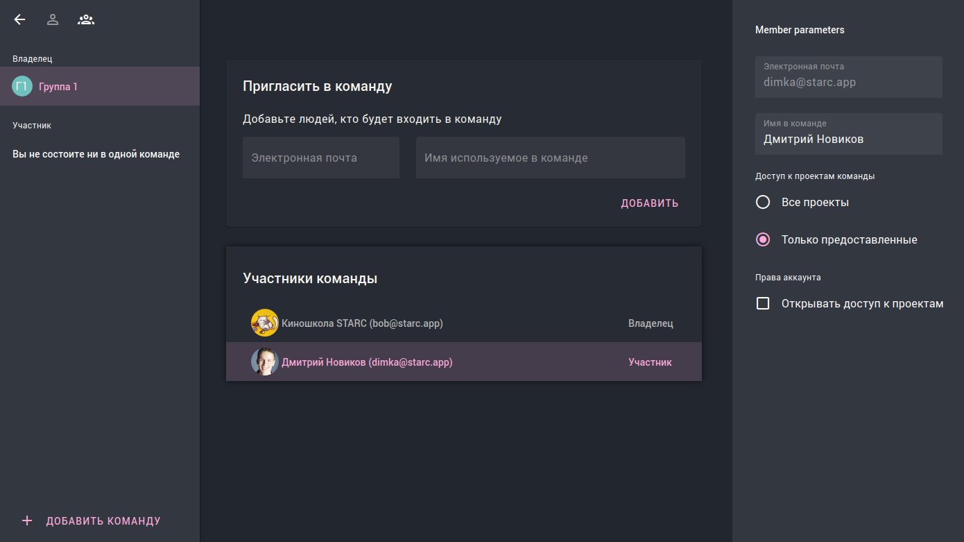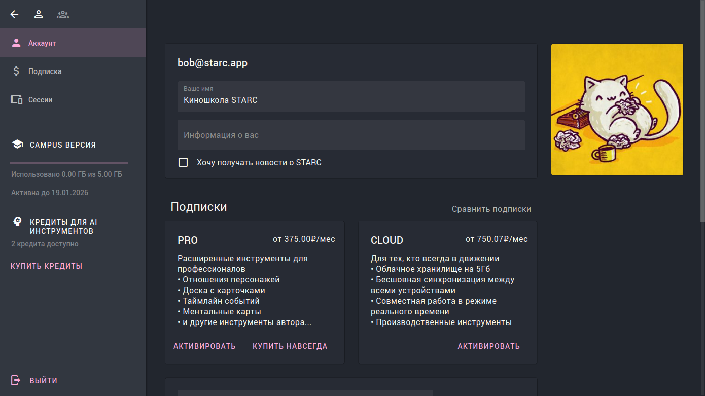 После добавления участника в команду ему автоматически предоставляется доступ к подписке CLOUD внутри сервиса. Это позволяет студенту пользоваться всеми возможностями Story Architect без ограничений.